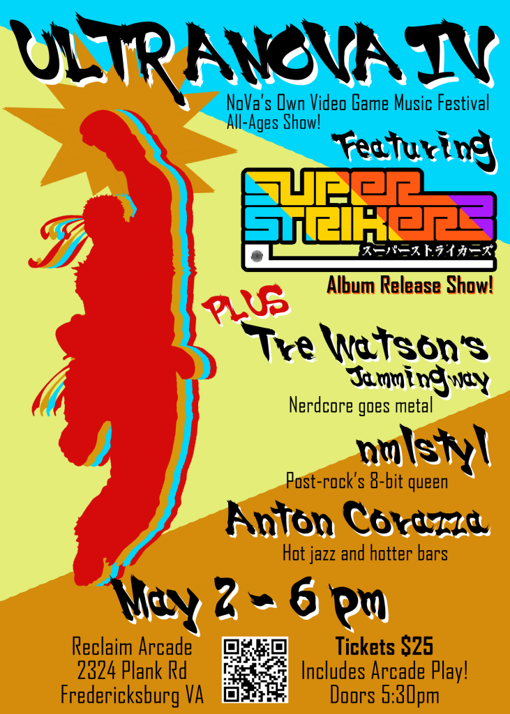 UltraNoVA, Northern Virginia’s yearly Video Game Music (VGM) festival returns for its fourth year at Reclaim Arcade in Fredericksburg, VA! Join us on May 2nd at 6pm for an evening of fantastic live music. Your ticket includes entry to Reclaim Arcade with over 75 classic arcade and pinball machines all on free play.